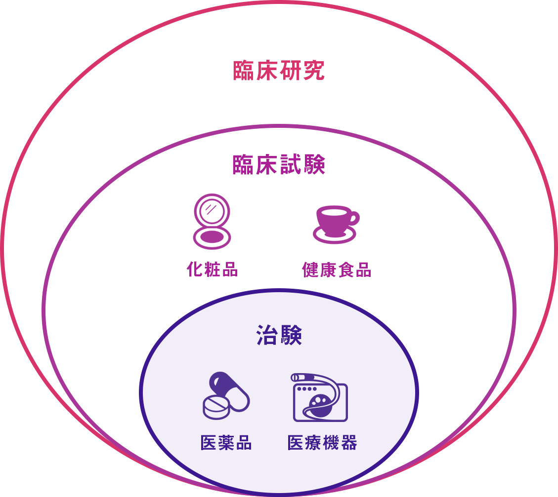 一般的に化粧品や保健機能食品(いわゆる健康食品)は臨床試験、医薬品や医療機器は治験が実施されます。